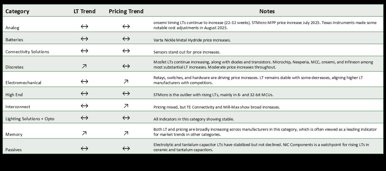 Most categories are stable, but Memory is key to watch as both LT and pricing are rising, and this category often signals broader market shifts.